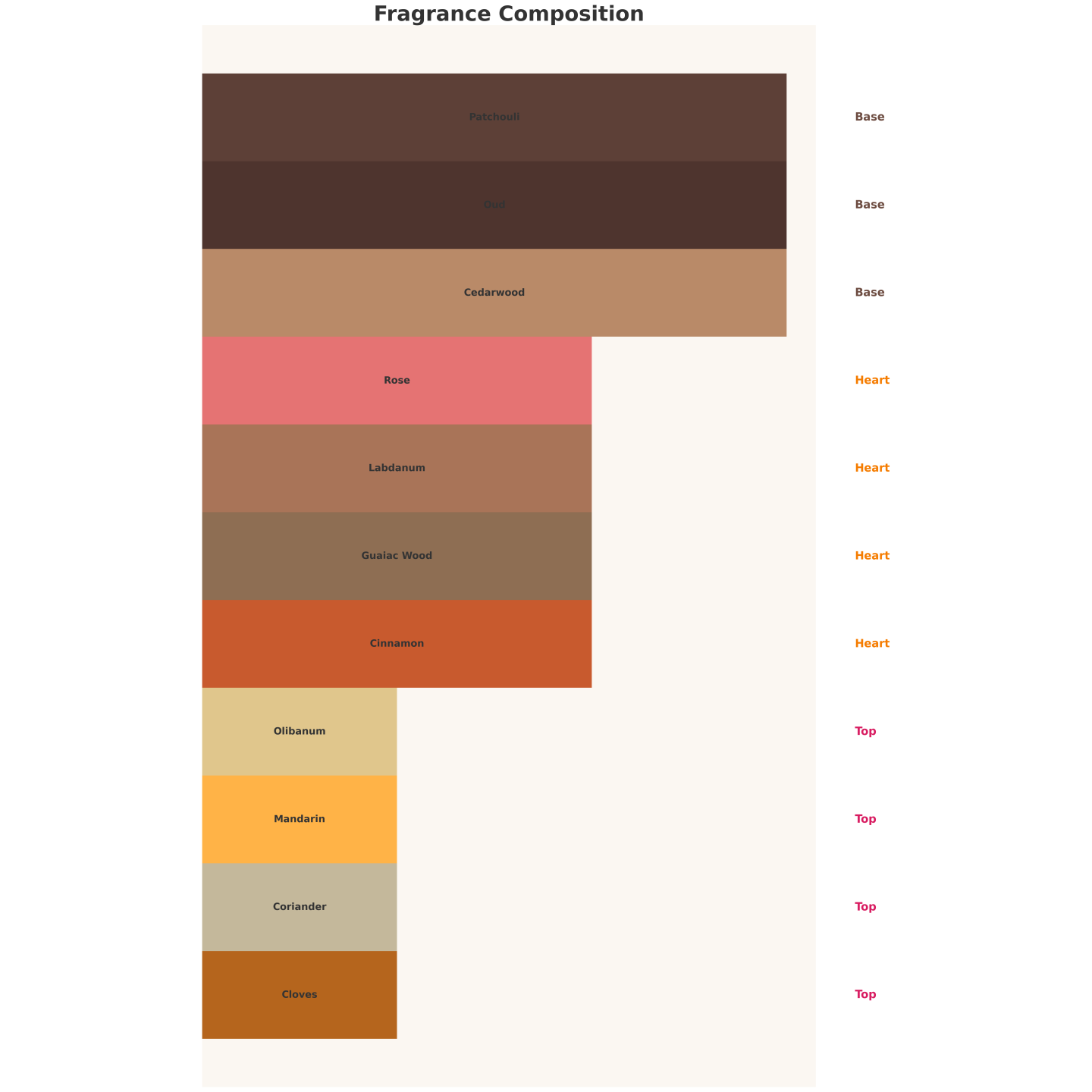 Orientalisch, würzig und holzig: Koriander und Nelken in der Kopfnote, Guajakholz und Labdanum in der Herznote sowie Zeder, Patschuli und Oud in der Basisnote.
