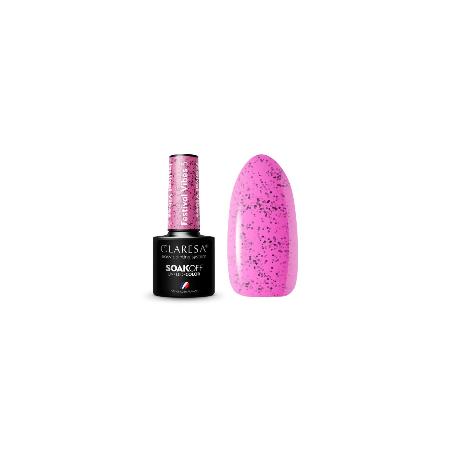 Festival Vibes 3 – intensiver, rosafarbener Hybridlack mit der Wirkung schwarzer Partikel. Es sorgt für ein problemloses Auftragen, ohne die Nagelhaut zu verschütten, und macht das Lackieren der Nägel einfach und präzise. Seine Formel garantiert intensiven Glanz und eine ideale, mittlere Dichte, wodurch Sie einen gleichmäßigen und professionellen Effekt erzielen können. Darüber hinaus hält der Lack bis zu 3 Wochen und Ihre Nägel bleiben lange schön und gepflegt.