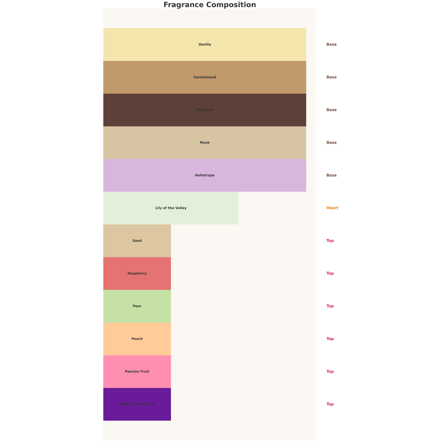 Es handelt sich um eine fruchtig-orientalische Komposition mit einem mineralischen Akzent von Sand, einem blumigen Herzen aus Maiglöckchen und einer weichen, cremigen Basis aus Moschus, Vanille, Patschuli und Heliotrop.