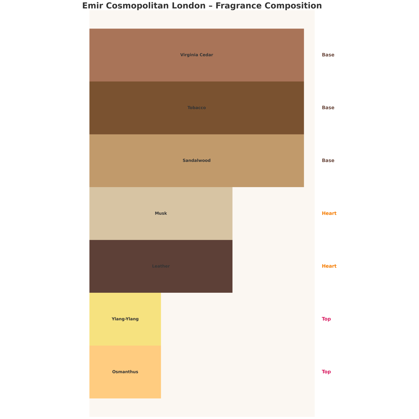 Emir Cosmopolitan London ist ein Duft, der die Atmosphäre der britischen Hauptstadt einfängt – einerseits vornehm und elegant, andererseits charaktervoll, lässig und geheimnisvoll. Diese Komposition ist für alle, die unverwechselbare, moderne Parfums mit einem Hauch klassischer britischer Eleganz schätzen. Die Kopfnote erinnert an einen Londoner Morgen: Bergamotte, trockener schwarzer Tee und würziger Pfeffer bilden einen kühlen, frischen und würzigen Auftakt voller Energie und Stil. Im Herzen des Duftes entfalten sich edle Iris, sinnliches Leder und aromatische Kräuter und verleihen der Komposition eine raffinierte Tiefe und eine maskulin-feminine Balance. Die Basisnote si cremigem Guajakholz, warmem Amber und einhüllendem Moschus sorgt für lange Haltbarkeit und einen weichen, eleganten Ausklang. Dieser Duft ist perfekt für kühle Tage, Abende, Treffen an stimmungsvollen Orten und Situationen, in denen Stil zählt – ohne unnötige Übertreibung, ale mit einem Hauch von Individualität.