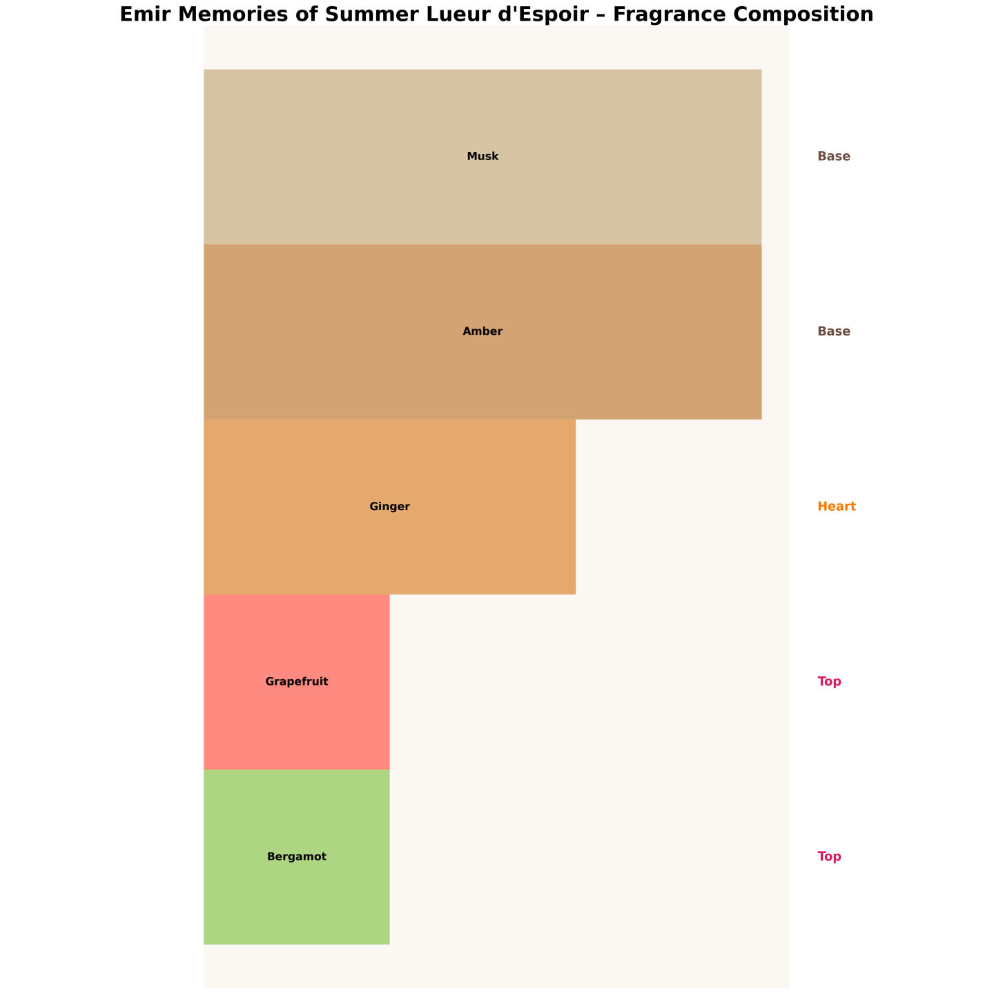 Emir Lueur D'espoir – Memories of Summer ist ein Duft, der wie die ersten Sonnenstrahlen auf einem azurblauen Meer funkelt. Er verströmt Unbeschwertheit, Leichtigkeit und sonnige Energie – wie ein si Urlaubstag, an dem man das Gefühl hat, alles sei möglich. Die Komposition eröffnet mit einer außergewöhnlich realistischen, saftigen Mischung aus Grapefruit und Bergamotte – frisch, spritzig und sofort belebend. Wie ein kühles Zitrusgetränk an einem heißen Tag, das sofortige Erfrischung schenkt. Ingwer findet sich in der Herznote wieder, jedoch nicht aufdringlich oder zu scharf – hier ist er elegant würzig, leicht spritzig und verleiht der Komposition Charakter, Klasse und eine besondere Note. Die Basisnote hüllt die Haut in die Wärme von Amber und sanftem Moschus und erzeugt den Eindruck sonnengewärmter Haut nach einem Bad im Meer. Sinnlich, rein und beruhigend, balanciert er perfekt die spritzige Zitrus-Kopfnote. Dieser Unisex-Duft ist für alle, die sich frisch, rein und luxuriös fühlen möchten – auf eine leichte ale unverwechselbare Weise. Perfekt für Liebhaber des Stils „stiller Luxus“, die subtiles Prestige lauten Reizen vorziehen.