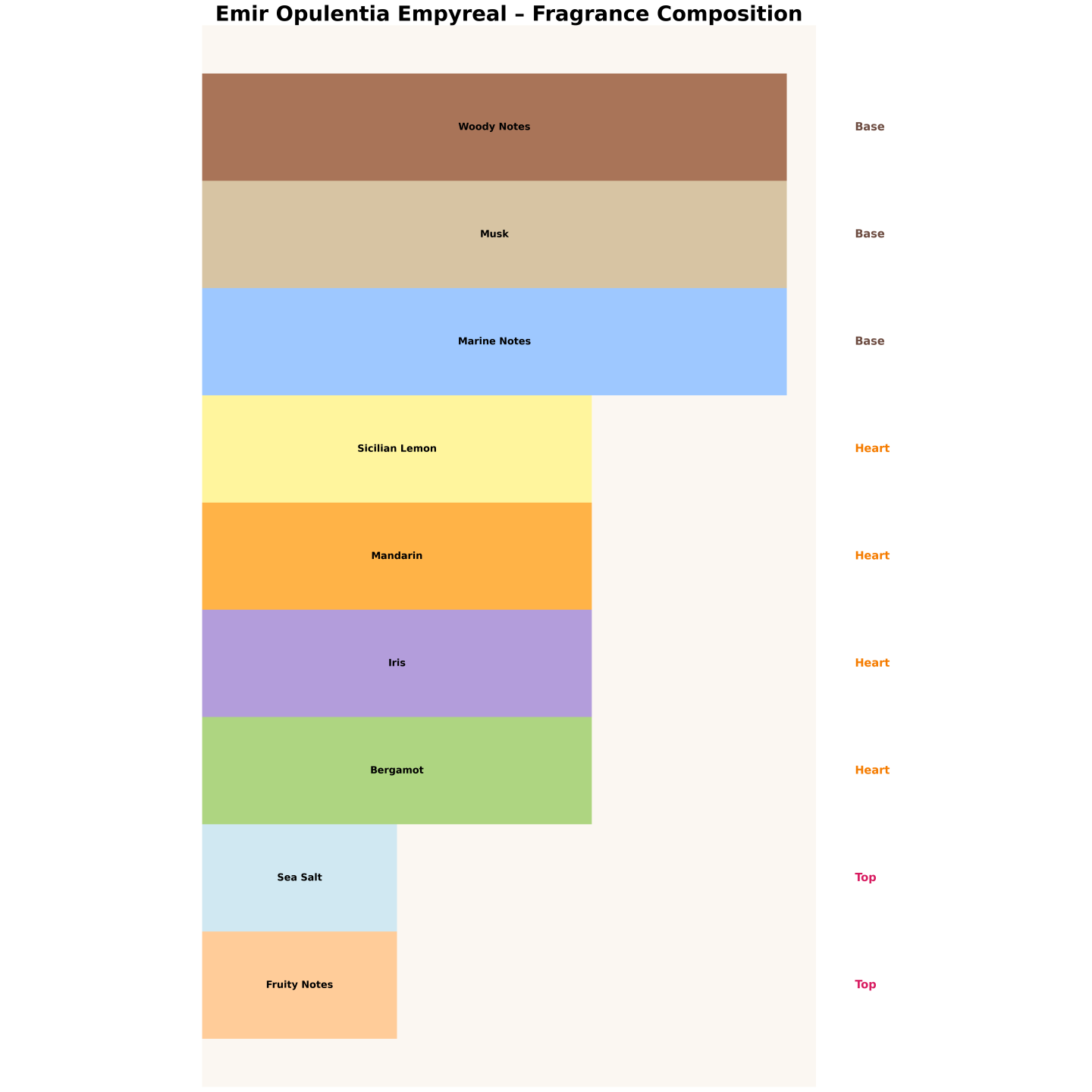 Opulentia Empyreal ist ein Duft für alle, die sich moderne, leichte Eleganz wünschen. Diese Komposition besticht durch Klasse, Klarheit und Harmonie – perfekt für Momente, in denen Sie frisch, stilvoll und strahlend duften möchten. si in eine luxuriöse Atmosphäre, in der Zitrus-, Blüten- und Holznoten zu einem reinen, harmonischen Ganzen verschmelzen. Der Duft eröffnet mit einer belebenden Mischung aus Früchten und mineralisch-frischem Meersalz, die sofort ein Gefühl von Reinheit und Strahlkraft vermittelt. Im Herzen der Komposition entfalten sich elegante Akkorde von sizilianischer Zitrone, spritziger Bergamotte, pudriger Iris und saftiger Mandarine – eine Kombination aus Frische, Zartheit und subtilem Luxus. Die Basisnote hüllt die Haut in einen sanften Schleier aus Meeresnoten, reinem Moschus und Holz, der der Komposition Langlebigkeit und einen raffinierten Ausklang verleiht. Dieser Duft ist ideal für alle, die leichte, elegante, klare und zeitlose Kompositionen lieben – und hinterlässt einen frischen, äußerst angenehmen Eindruck.