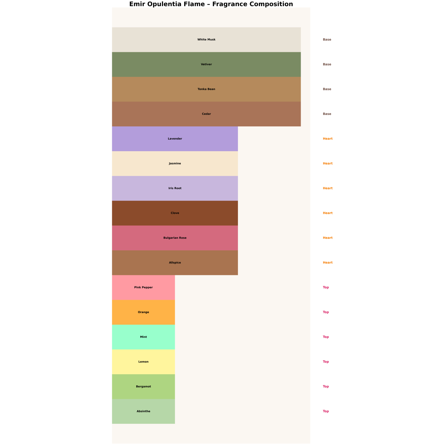 Opulentia Flame ist ein Duft für alle, die sich von der Masse si und ihre Präsenz bewusst durch Duft unterstreichen möchten. Dieses Parfum besitzt eine intensive, feurige Seele – voller Energie, Mut und magnetischer Anziehungskraft. Der ausdrucksstarke Auftakt, die würzige Fülle der Herznote und die elegante, holzig-moschusartige Basis bilden ein harmonisches und zugleich kompromissloses Ganzes. Der Auftakt beginnt mit einem kräftigen Akzent aus rosa Pfeffer, frischer Minze, Bergamotte, Zitrone, trockenem Absinth und saftiger Orange – eine explosive Mischung aus Frische und würziger Spritzigkeit. Die Herznote pulsiert mit aromatischer und blumiger Fülle: Lavendel, bulgarische Rose, Nelke, Piment, Jasmin und pudrige Iriswurzel bilden eine elegante, intensive und vielschichtige Mittelnote. Die Basisnote aus erdigem Vetiver, edler Zeder, sanftem weißem Moschus und cremiger Tonkabohne verleiht dem Duft Wärme, Langlebigkeit und einen sinnlichen Ausklang. Dieser Duft ist für alle, die ihre innere Leidenschaft – Entschlossenheit, Spontaneität und Tatendrang – spüren wollen. Perfekt für alle, die bei jedem Anlass einen bleibenden Eindruck hinterlassen möchten.
