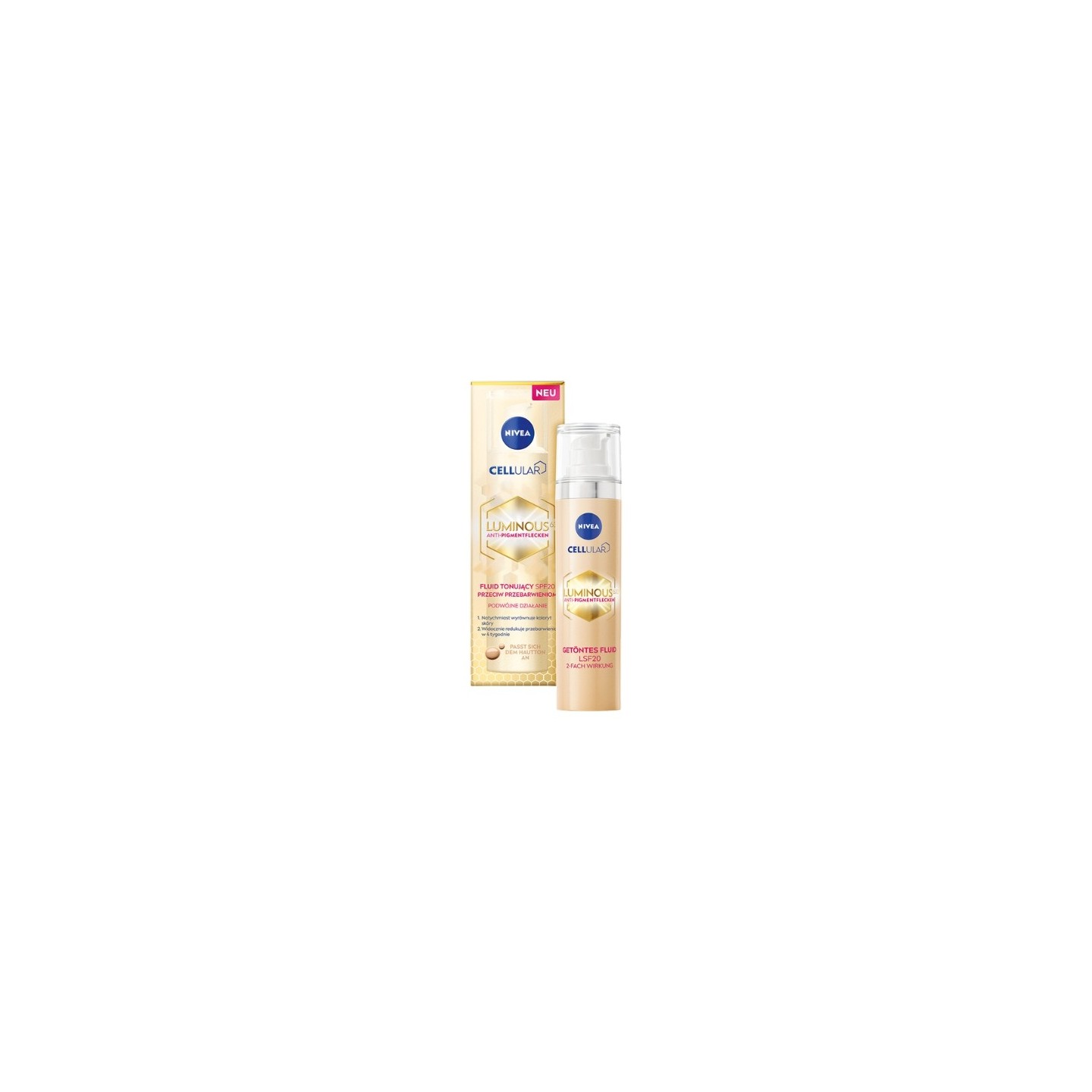 Entdecken Sie das Geheimnis schöner Haut mit dem NIVEA Cellular Luminous Toning Fluid. Es enthält Hyaluronsäure, spendet der Haut perfekte Feuchtigkeit und glättet sie und schützt sie dank des SPF 20-Filtersystems gleichzeitig vor den schädlichen Auswirkungen von UVB-/UVA-Strahlen.