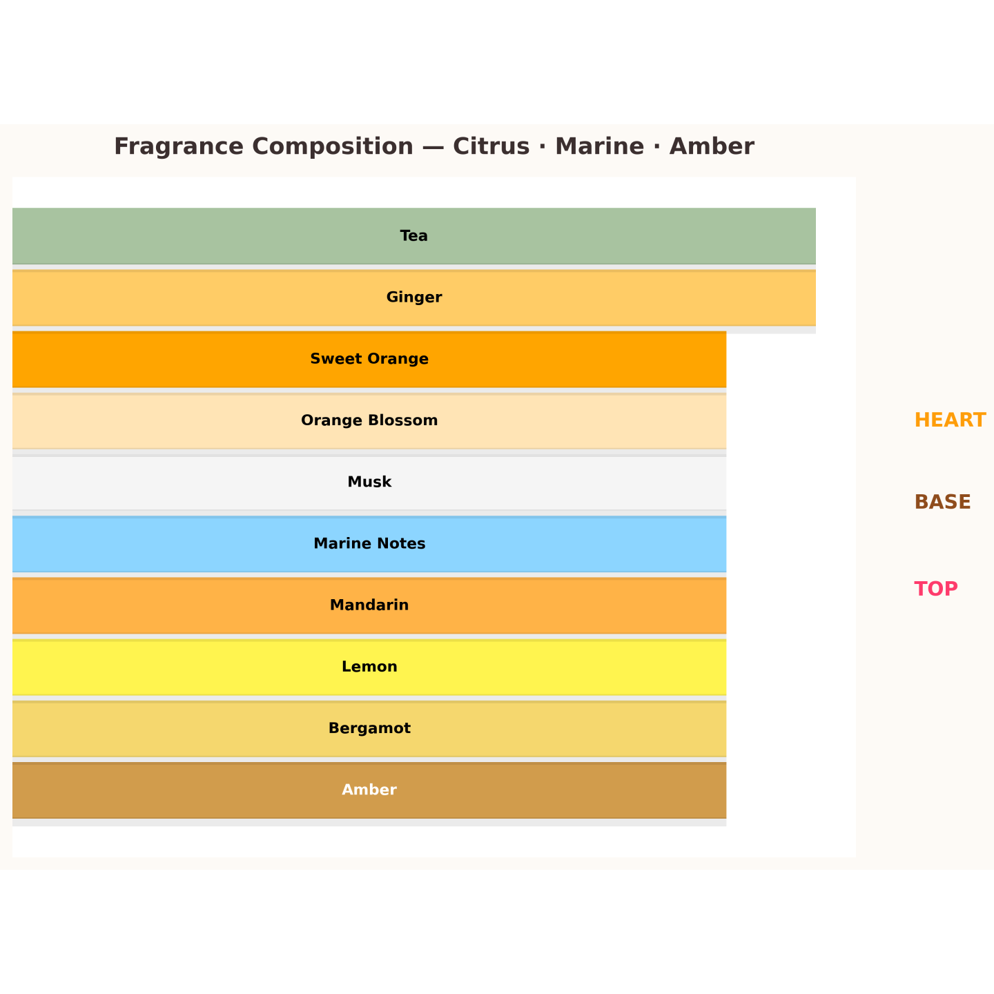 Unisex Eau de Parfum mit Zitruscharakter, das saftige Zitrone, Orange und Mandarine mit Ingwer, maritimen Noten und der Wärme von Amber und Moschus kombiniert – perfekt für den Sommer und warme Tage