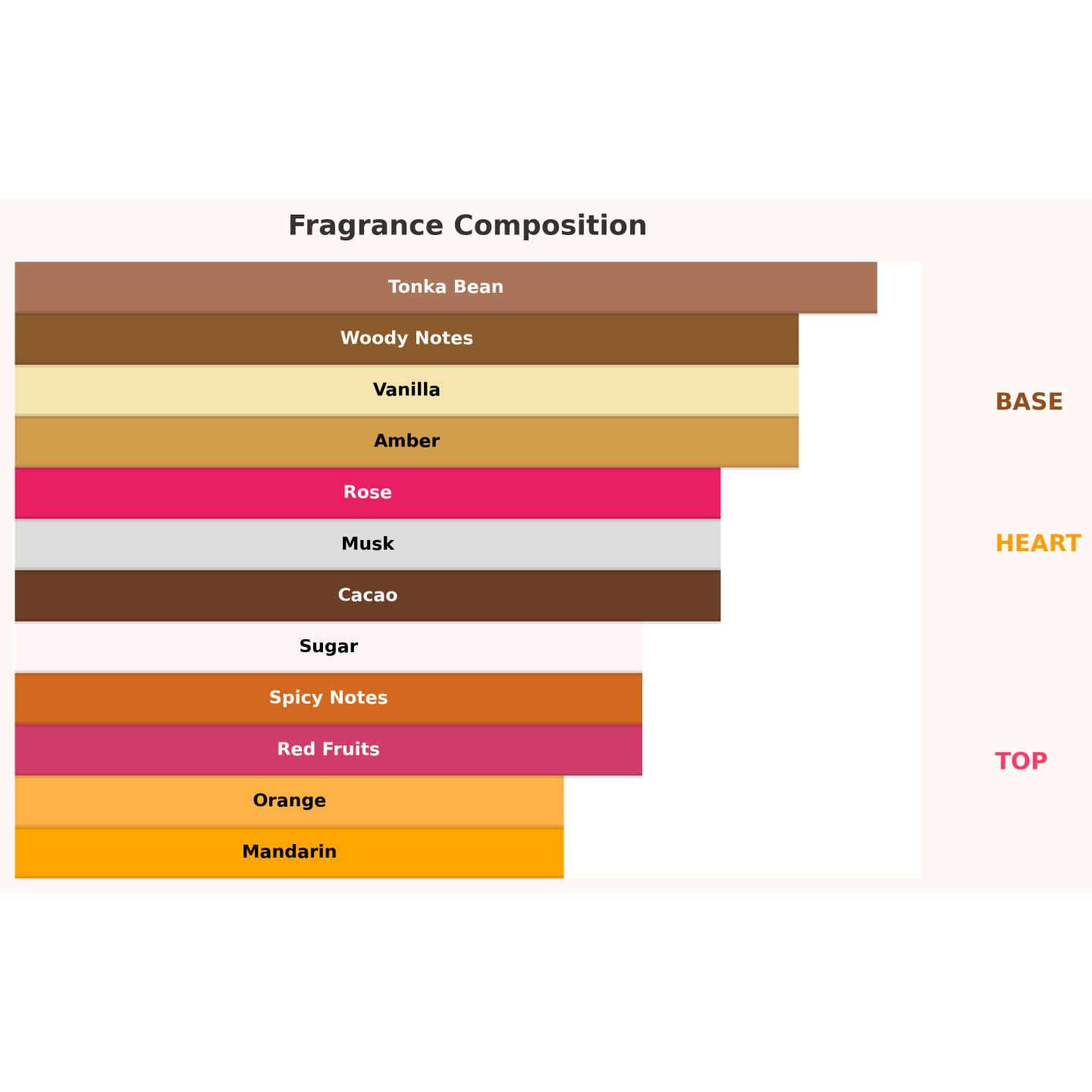 Ein sinnlicher und zugleich subtiler Gourmand, der fröhliche, fruchtige Frische mit Wärme und Eleganz verbindet. Die Kopfnote besteht aus Zucker, roten Früchten, Mandarine und Orange – ein leicht süßes, belebendes Erlebnis. In der Herznote sorgen Vanille, Kakao, Gewürze und Rose für cremige Weichheit und intime Tiefe. Eine Basis aus Tonkabohne, Amber, Moschus und holzigen Noten hinterlässt einen langen, samtigen Duft.