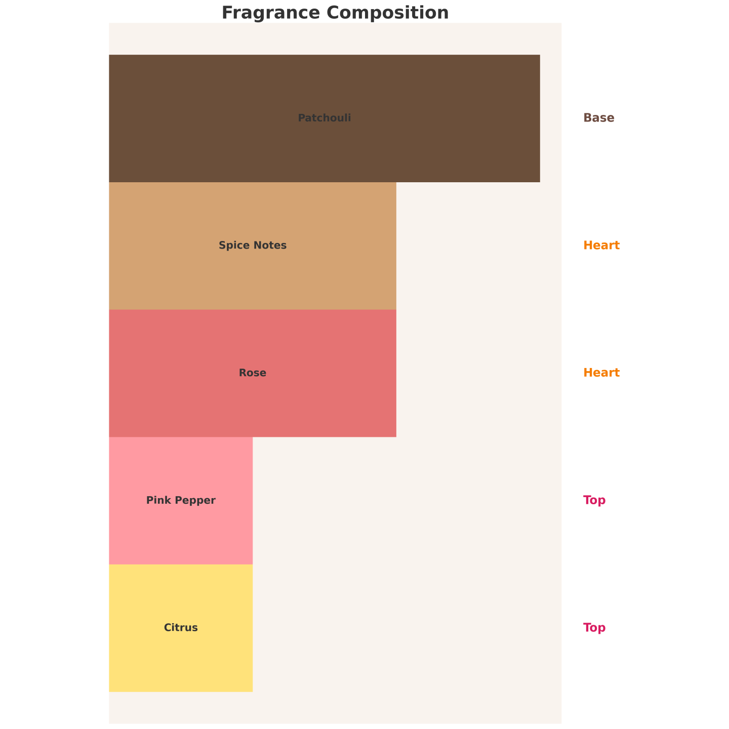 Es ist ein zitrusartiger, frischer Duft mit einer leicht würzigen Note von rosa Pfeffer und einem eleganten, blumigen Herzen aus Rose. Eine Patschuli-Basis verleiht ihm Klasse und Haltbarkeit.