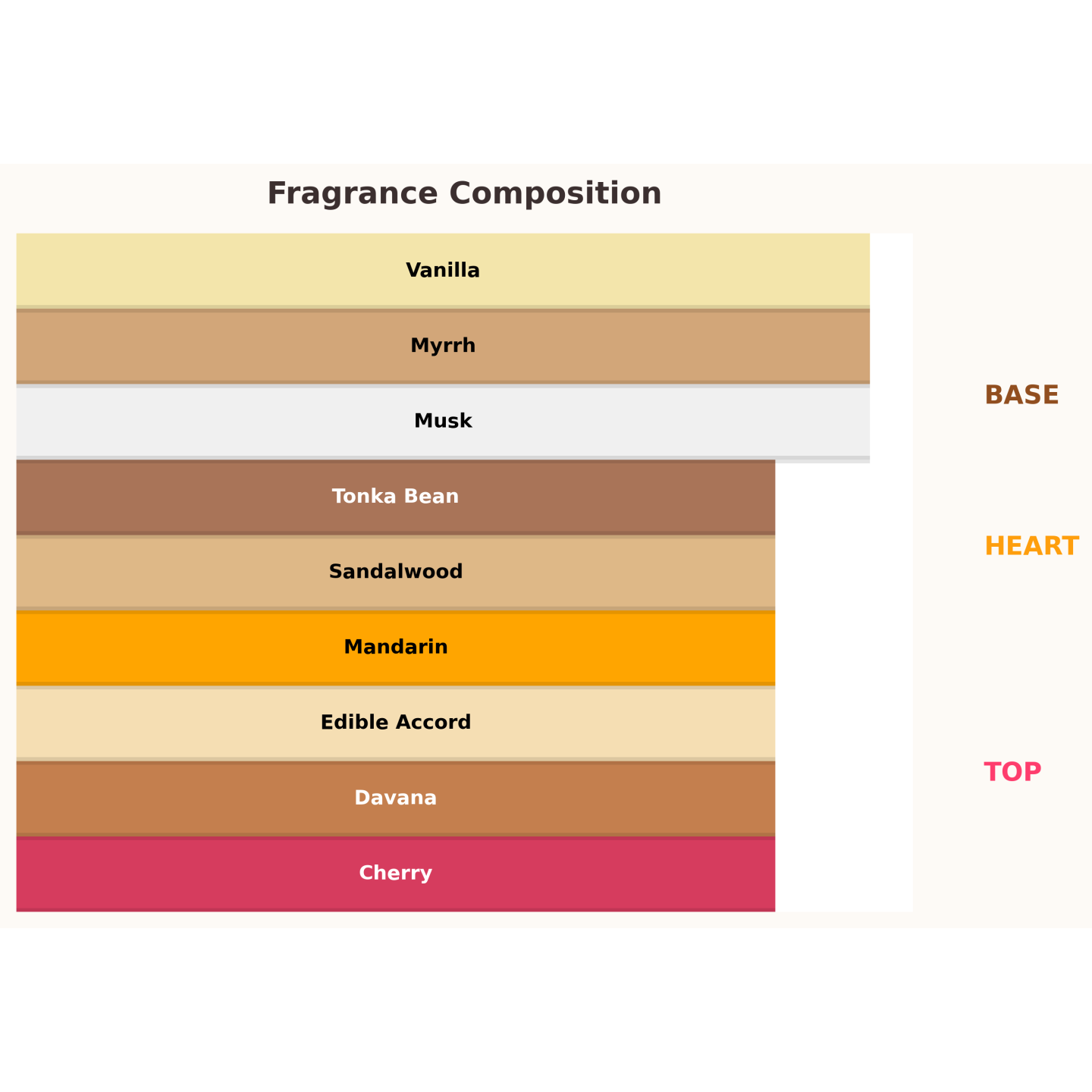 ✔ Wie riecht Sweet Heaven Cherry? Kirsche und Mandarine mit Davana in der Kopfnote; Myrrhe und Sandelholz mit einem essbaren Akkord in der Herznote; Moschus, Vanille und Tonkabohne in der Basisnote.