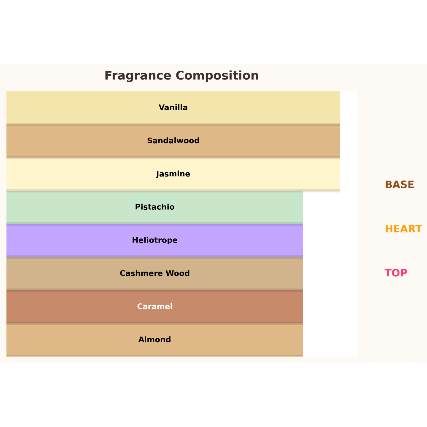 ✔ Wie duftet Minya? Ein süßer und cremiger Gourmand: Mandel und Pistazie, ein blumiges Herz (Jasmin, Heliotrop) auf Kaschmirholz und eine Basis aus Vanille, Karamell und Sandelholz.