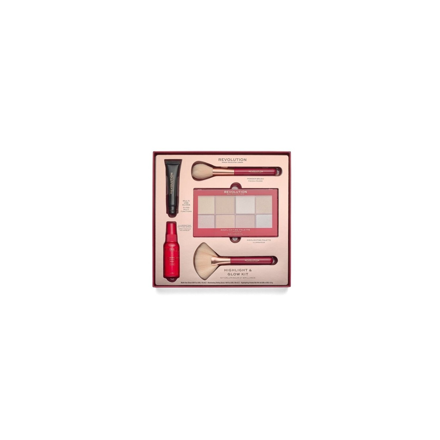 • Revolution Highlight Glow Kit: Palette mit 8 Textmarkern, Fixierspray, Lipgloss und 2 Make-up-Pinseln