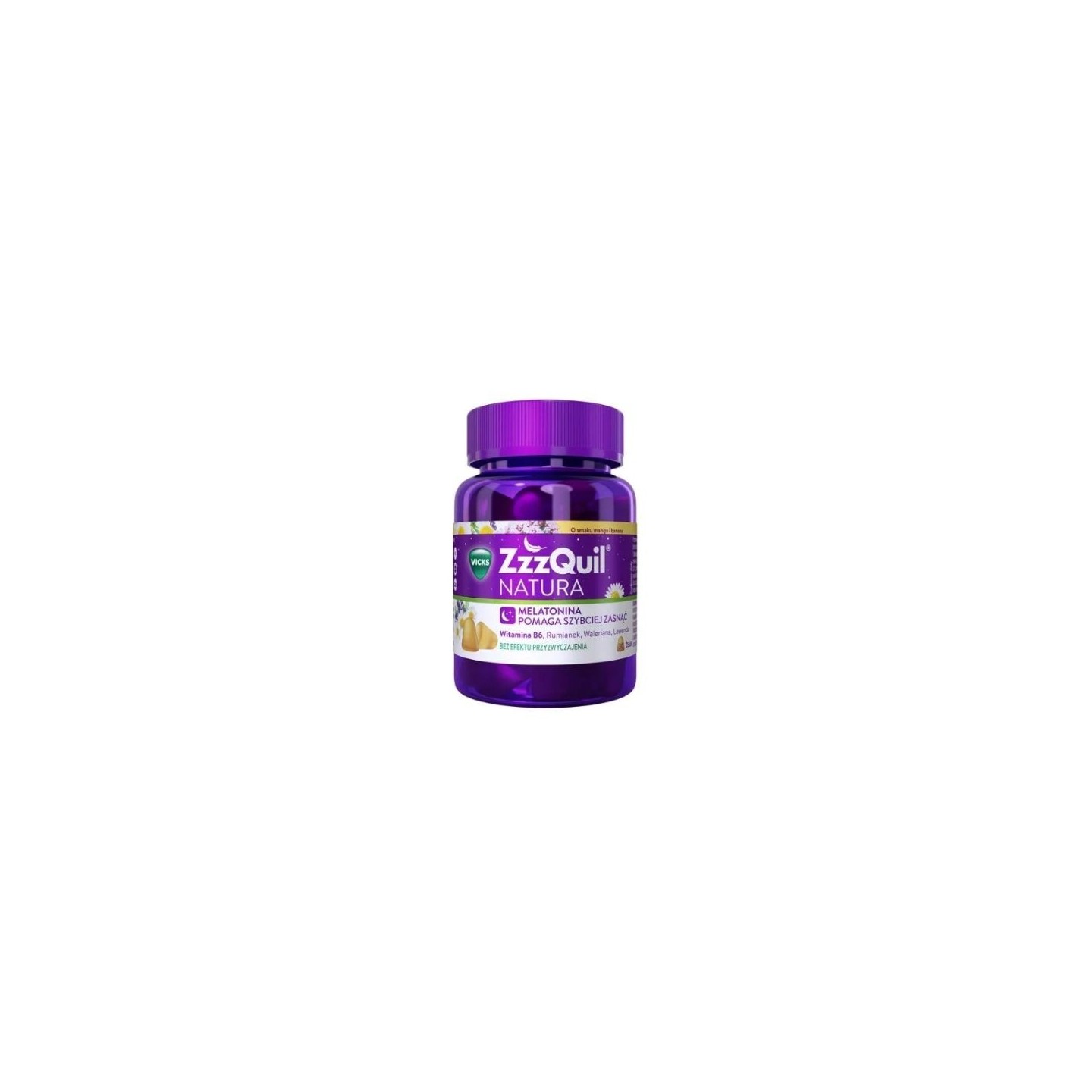 ZzzQuil Natura , Gelees mit Mango- und Bananengeschmack, ist ein Nahrungsergänzungsmittel für Erwachsene, die Einschlafschwierigkeiten haben. Die enthaltenen Inhaltsstoffe unterstützen den natürlichen Einschlafprozess und sorgen so für einen erholsamen und regenerierenden Schlaf.