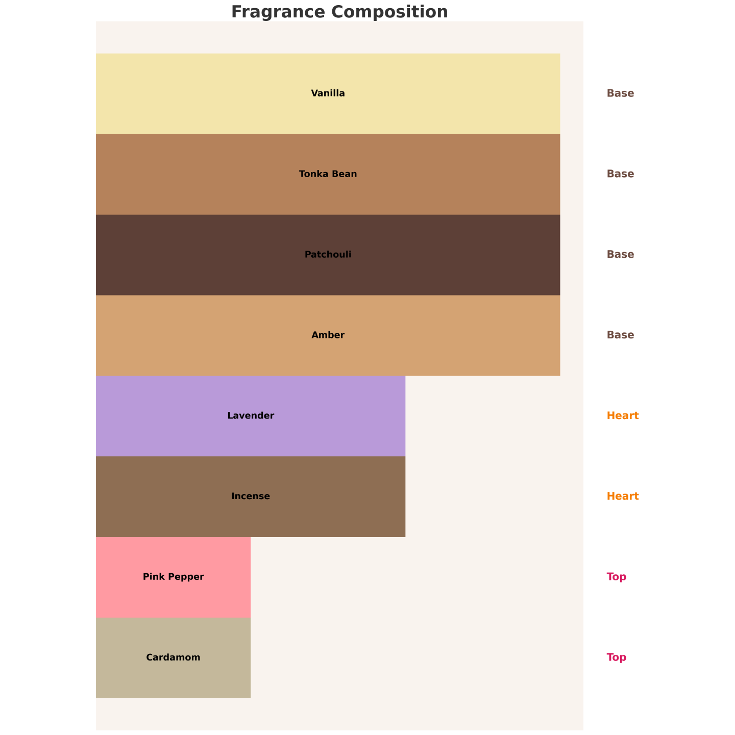 Orientalisch und würzig – würziger Kardamom und rosa Pfeffer, aromatischer Lavendel, Weihrauch und eine süß-balsamische Basis aus Vanille, Tonkabohne und Amber.