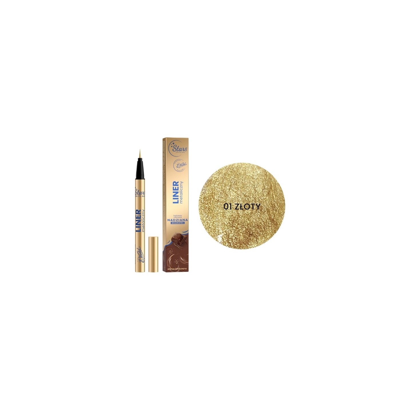 Metallic eyeliner is a unique cosmetic that combines ultra-durability with amazing visual effects, inspired by the intensely chocolate NADZIANA collection from E.Wedel. This metallic-glitter eyeliner allows you to create not only classic lines along the lash line, ale also sophisticated, graphic shapes, thanks to the super-precise brush tip. The formula is waterproof, which ensures perfect makeup all day long - resistant to moisture, sweat and abrasion. The eyeliner is available in two dazzling shades inspired by the insane packaging of NADZIANA DESSERTOWA chocolate: