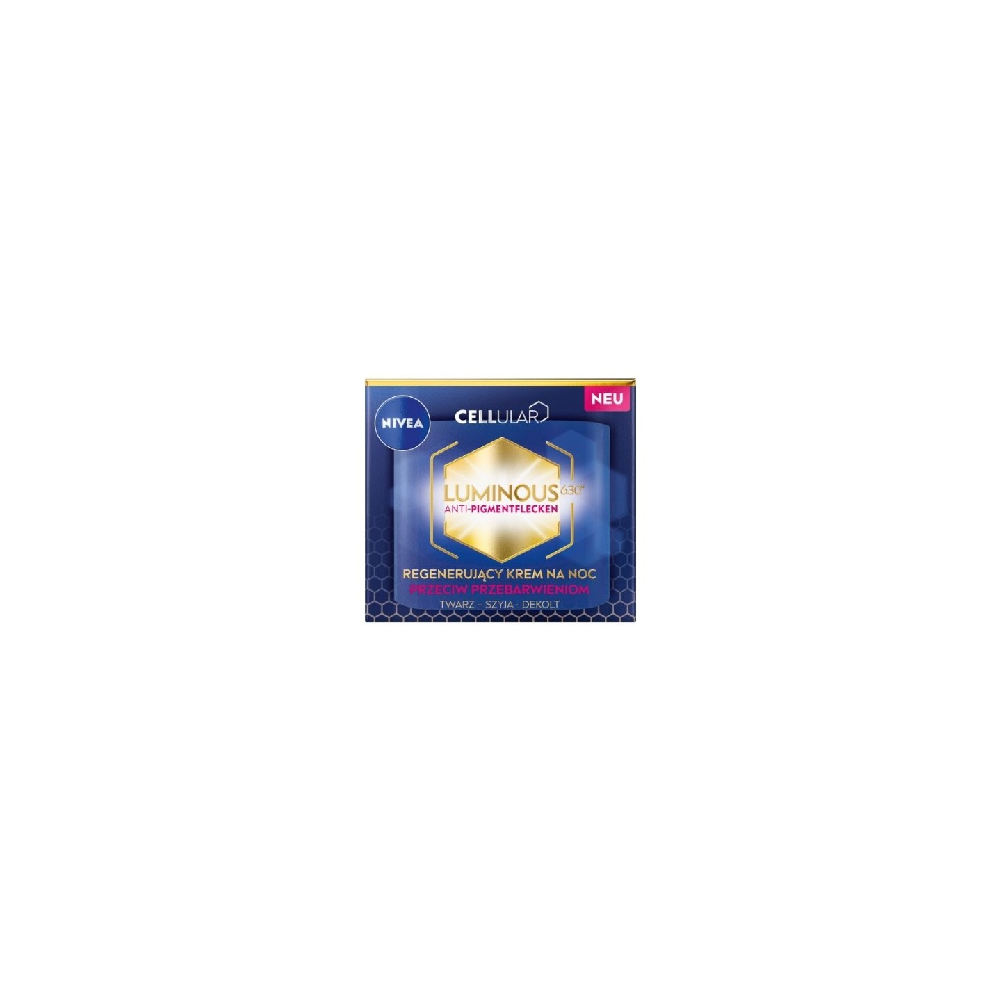 Regenerating night cream for discolorations is a product that provides the skin with overnight regeneration thanks to the patented ingredient LUMINOUS 630. This cream focuses on lightening existing discolorations and reducing their surface. Thanks to NIVEA Luminous 630, which supports the production of melanin in the skin, the product evens out the skin tone, and hyaluronic acid helps regenerate and strengthen the skin. With regular use, the effects are visible after 4 weeks. The cream is gentle on the skin and suitable for all skin tones and types, including sensitive skin.