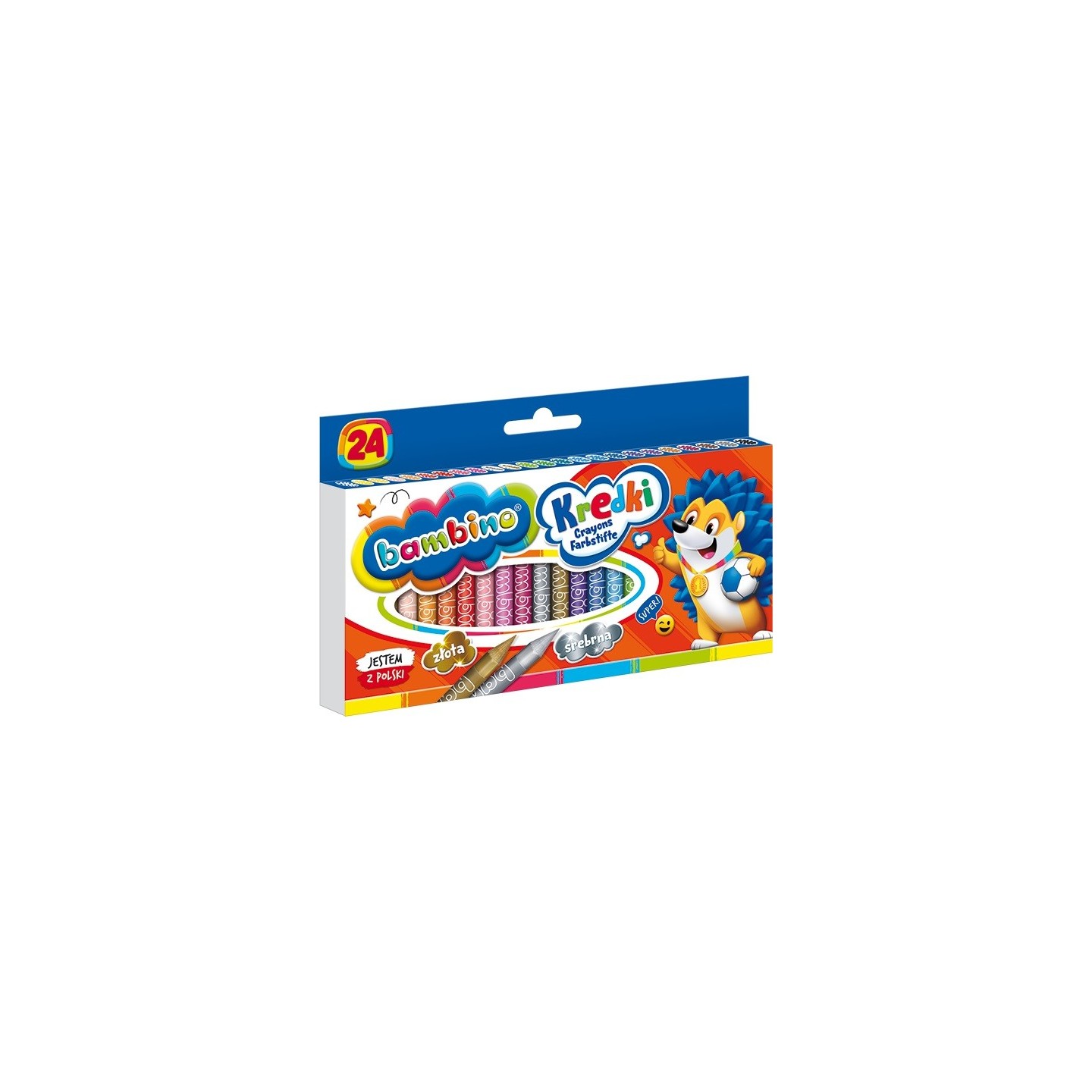 BAMBINO crayons include 24 intense colors in an attractive set, perfect for little artists over 3 years of age. Made of kaolin clay, the crayons cover the surface perfectly and are easy to use. Each crayon has a paper wrapper with a graphic motif, and the set also includes a gold and silver crayon. Safe, meet toy safety standards. Polish production guarantees high quality.