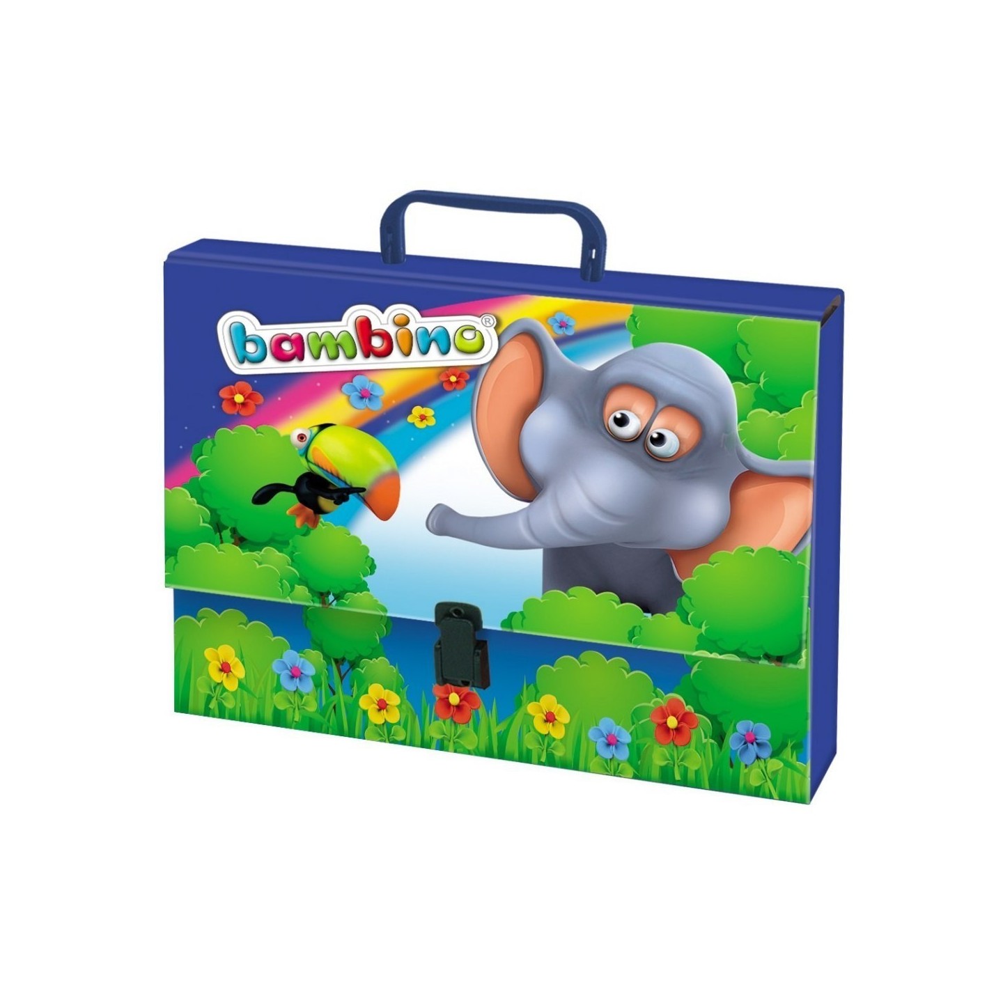 - a folder with a handle for carrying and storing documents, teaching aids or art works