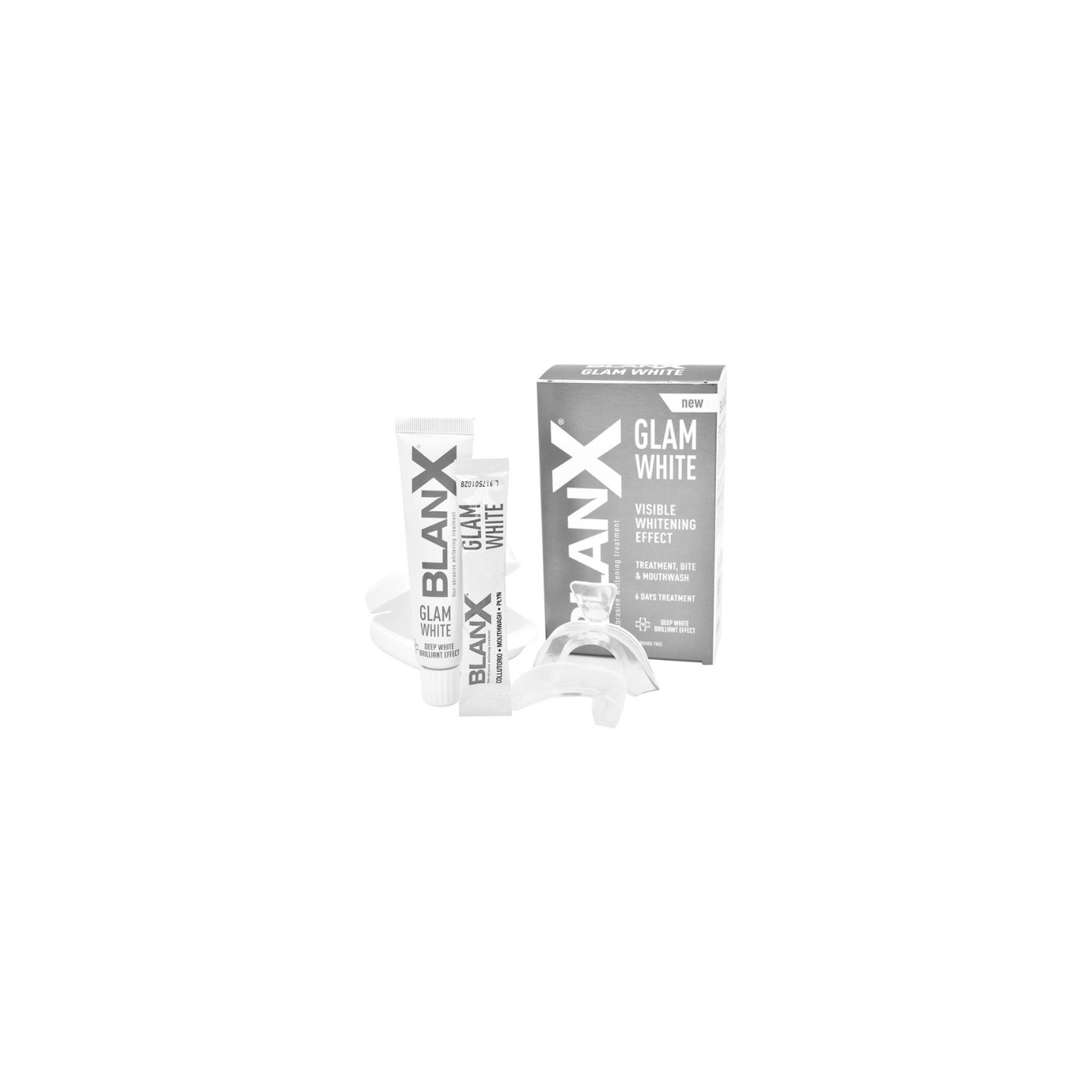 6-daagse express whitening behandeling voor een natuurlijk witte glimlach. Een innovatief bleeksysteem waarmee u in slechts 6 dagen de natuurlijke witheid van uw tanden terugkrijgt. Deze veilige en niet-schurende behandeling is speciaal gemaakt voor diegenen die in korte tijd een stralende glimlach willen. BlanX Glam White set bevat een serum , mondwaterzakjes en thermovormbare bakjes voor de bovenste en onderste tandboog. Het is een uitgebreide oplossing die een effectieve en gemakkelijke toepassing biedt. Het unieke aan de bleekbehandeling zijn de actieve PAP-deeltjes, die speciaal zijn ontwikkeld voor een snel en zichtbaar bleekeffect. PAP-moleculen verminderen effectief verkleuring en hebben tegelijkertijd een langdurig antibacterieel effect, ter ondersteuning van de mondgezondheid. Belangrijk is dat de formule geen waterstofperoxide of andere gevaarlijke chemische verbindingen bevat, waardoor het volkomen veilig is voor je slijmvliezen. Het vereist ook geen warmte of UV-lampen.