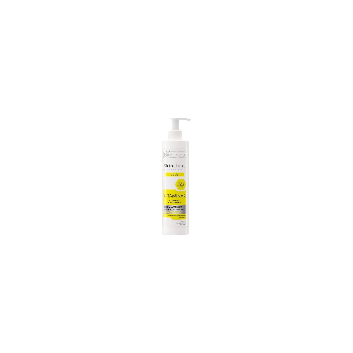 Bielenda Skin Clinic Professional Body Nourishing and Regenerating Ampoule Serum met vitamine C is een innovatief cosmetisch product, geïnspireerd op professionele salonbehandelingen. Het is ontwikkeld voor de huid die intensieve regeneratie, voeding en herstel van de natuurlijke glans nodig heeft. De formule, gebaseerd op het 10% Regenboost-complex, combineert de werking van drie belangrijke actieve ingrediënten: vitamine C, ceramiden en niacinamide. Dit serum biedt voordelen op meerdere niveaus: het verheldert de huid, verbetert de conditie en ondersteunt de reconstructie van de hydrolipidenbarrière. De lichte, comfortabele textuur si snel in en laat geen vettig laagje achter, waardoor het perfect is voor de dagelijkse ego – vooral na het douchen of scrubben.