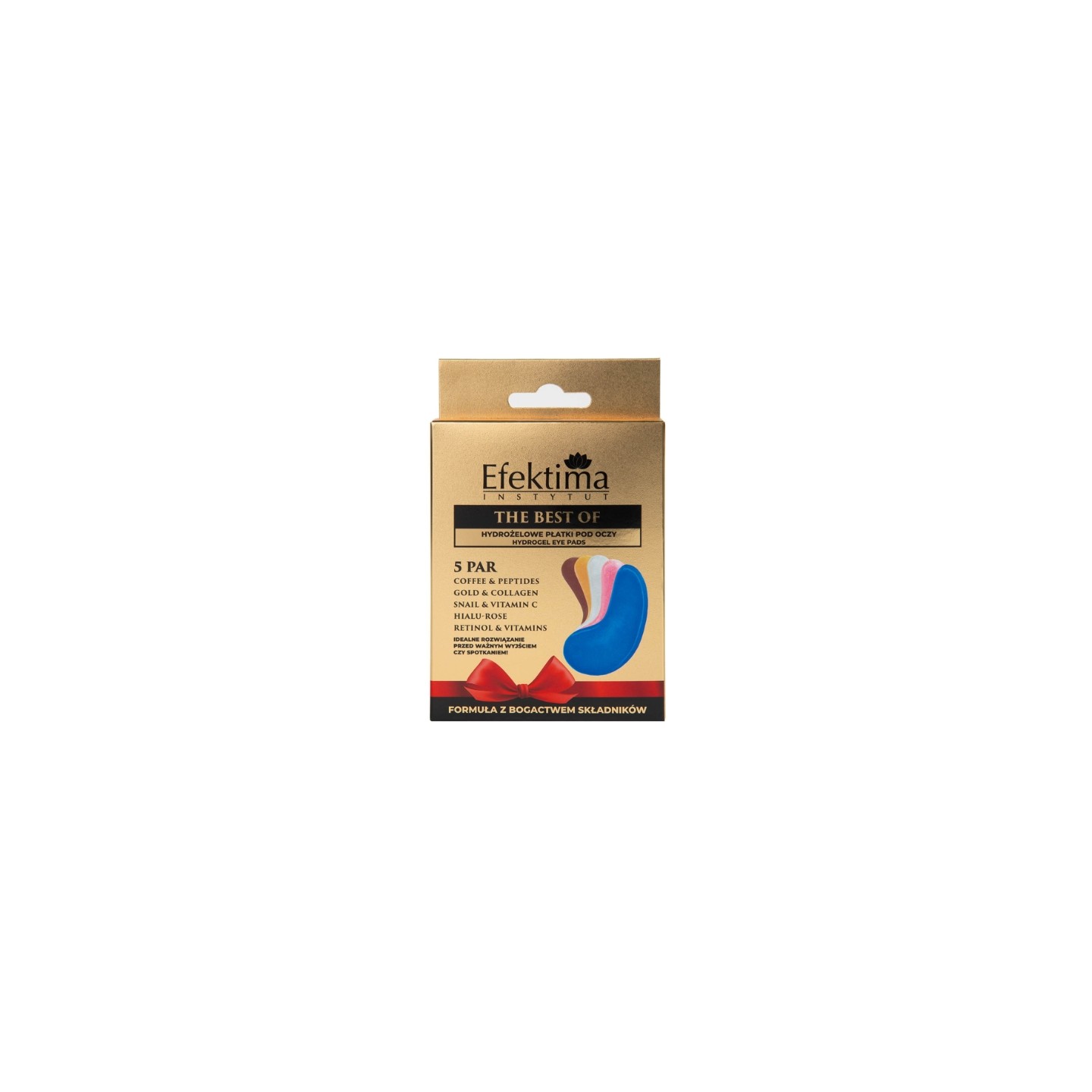 Efektima The Best Of is een set van bestverkochte hydrogel oogpatches, ontworpen om de diverse behoeften van de delicate huid rond de ogen aan te pakken – van donkere kringen en vermoeidheid tot wallen, de eerste rimpels en verlies van stevigheid. Elke variant bevat een unieke mix van actieve ingrediënten met bewezen effectiviteit, zoals cafeïne, peptiden, collageen, slakkenslijm, vitamine C, retinol en hyaluronzuur. De hydrogelbasis garandeert een direct verkoelend effect, verbetert de opname van actieve ingrediënten en is comfortabel in gebruik. De patches hechten perfect aan de huid, waardoor je snel kunt si van een "uitgeruste ogen"-effect.