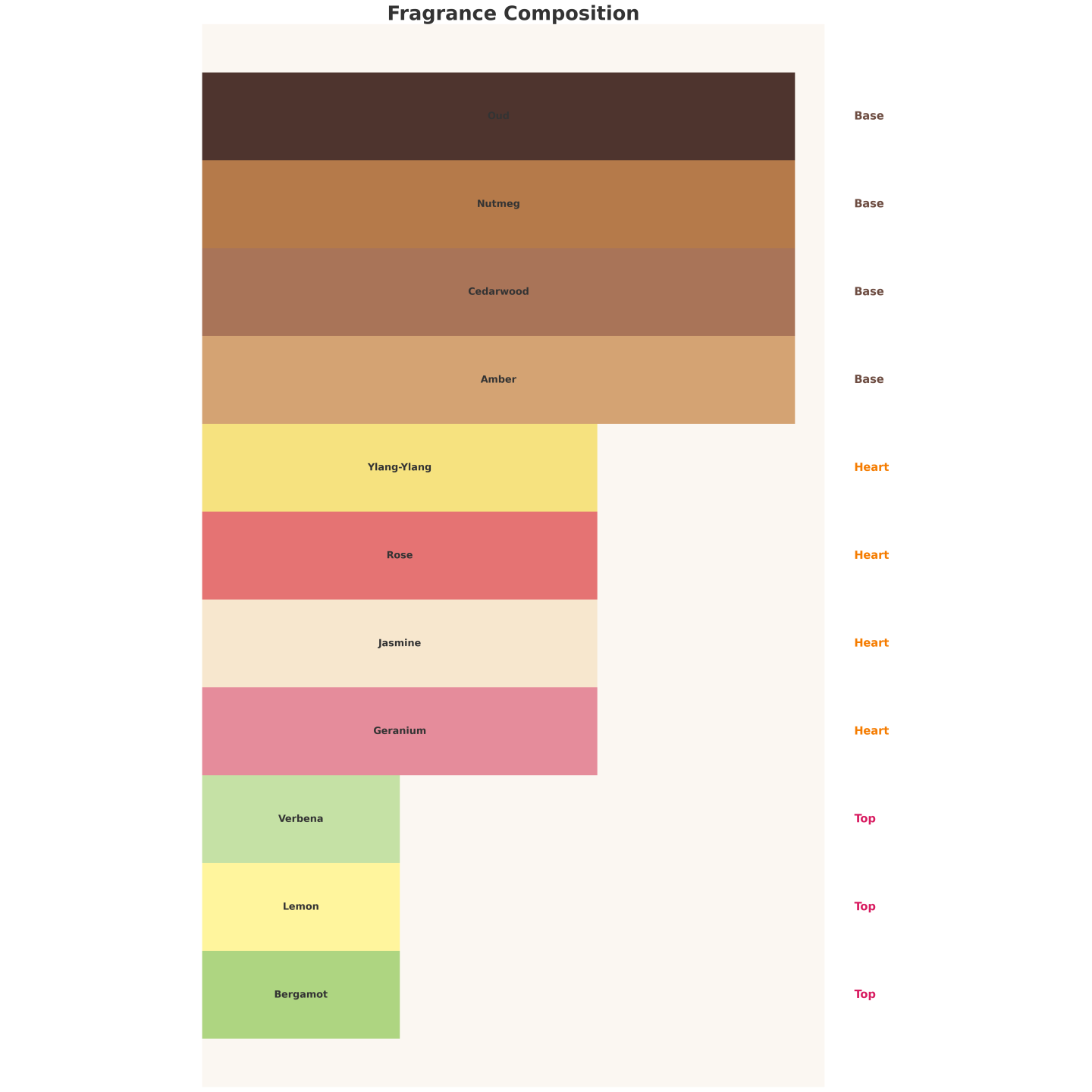Świeżo w otwarciu (cytryna, bergamotka, werbena), elegancko kwiatowo w sercu (jaśmin, róża, ylang-ylang) i głęboko orientalnie w bazie (oud, ambra, cedr).