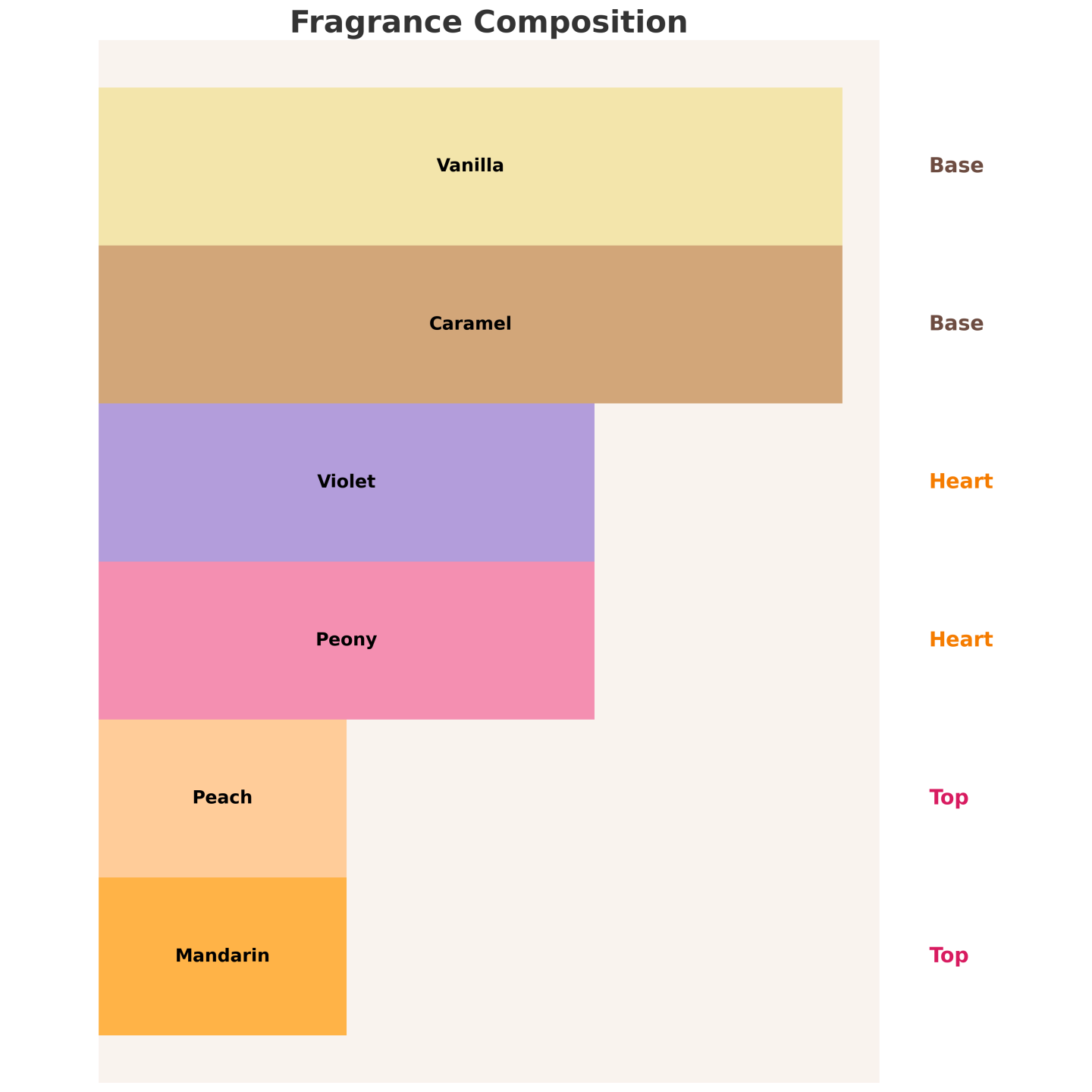 Owocowo, kwiatowo i zmysłowo: soczyste brzoskwinia i mandarynka, romantyczna peonia i fiołek, ciepła wanilia i karmel.